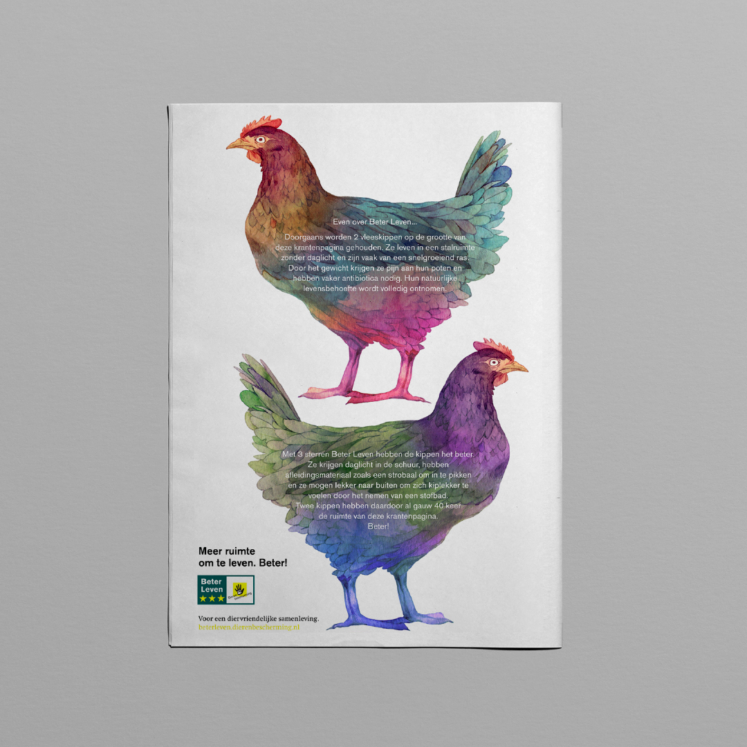 We kozen voor een helder en voelbaar criterium binnen het keurmerk: ruimte. Een natuurlijke levensbehoefte die vee in de reguliere veehouderij vaak moet missen: meer ruimte om te leven. De beperkte ruimte waarin dieren leven, vertaalden we naar de beperkte afmeting van het medium zelf. Een abri werd een deel van de kippenstal. Een krantenpagina, een hok. Het formaat van een tv confronteerde de kijker met de beperkte ruimte waar varkens in leven. En op radio maakten we de afmeting van een studeerkamer en van de auto relevant. Zo maakten we dierenleed niet abstract, maar pijnlijk invoelbaar en visueel tastbaar.